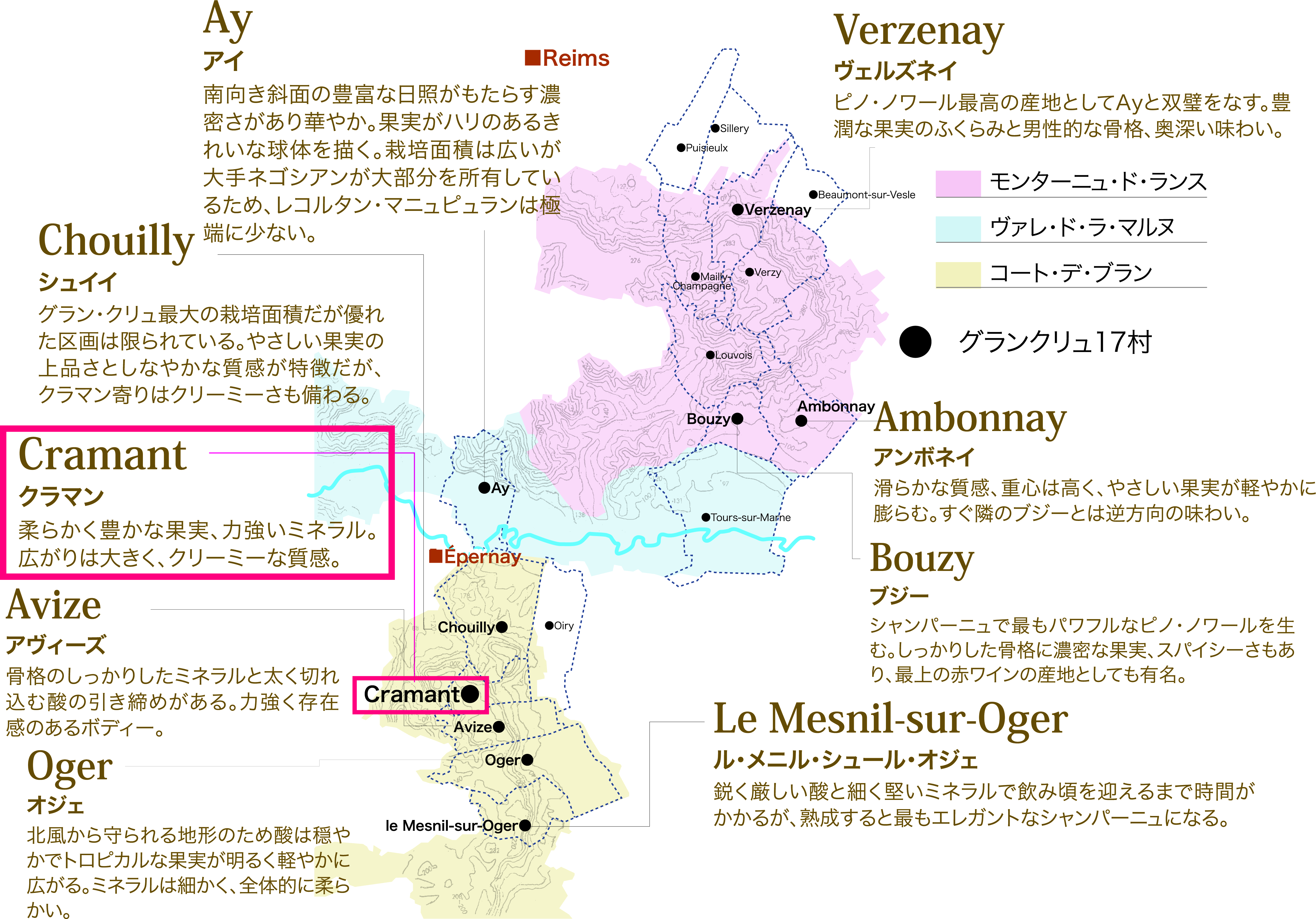 グランクリュの17村で造られるシャンパーニュには一つ一つ異なる個性がありますが、なかでもクラマン村は、柔らかく豊かな果実味といきいきとしたミネラルがあり、大きな広がりとクリーミーな質感が特徴のブラン・ド・ブランを生み出します。こうした特徴はまさに繊細で素材の味わいを活かす和食と相性が良く、日本人の味覚に寄り添うシャンパーニュ造りのために最適な村であるといえます。
