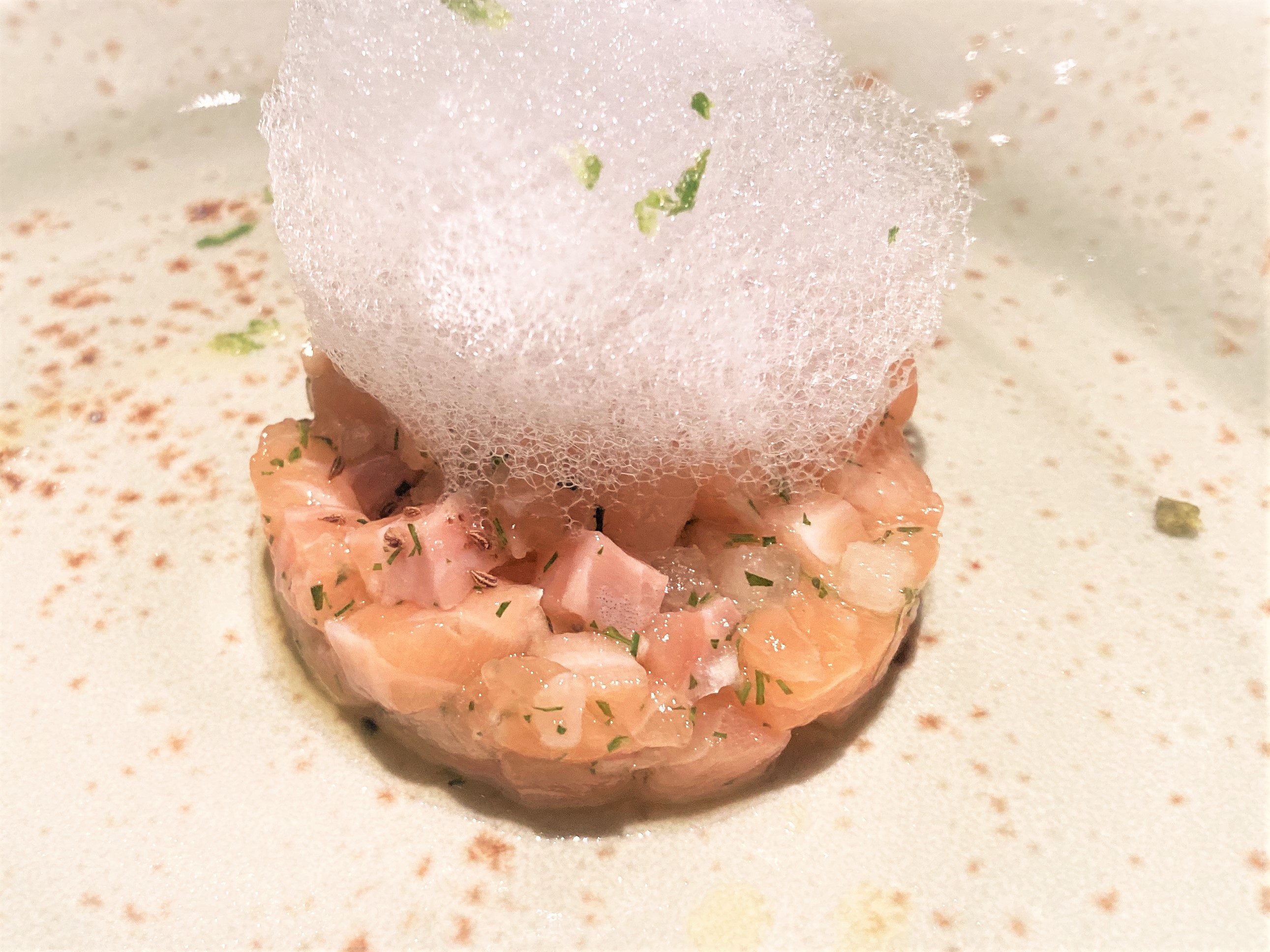 ②高島市産ビワマスのタルタル 梨とハーブのピックル