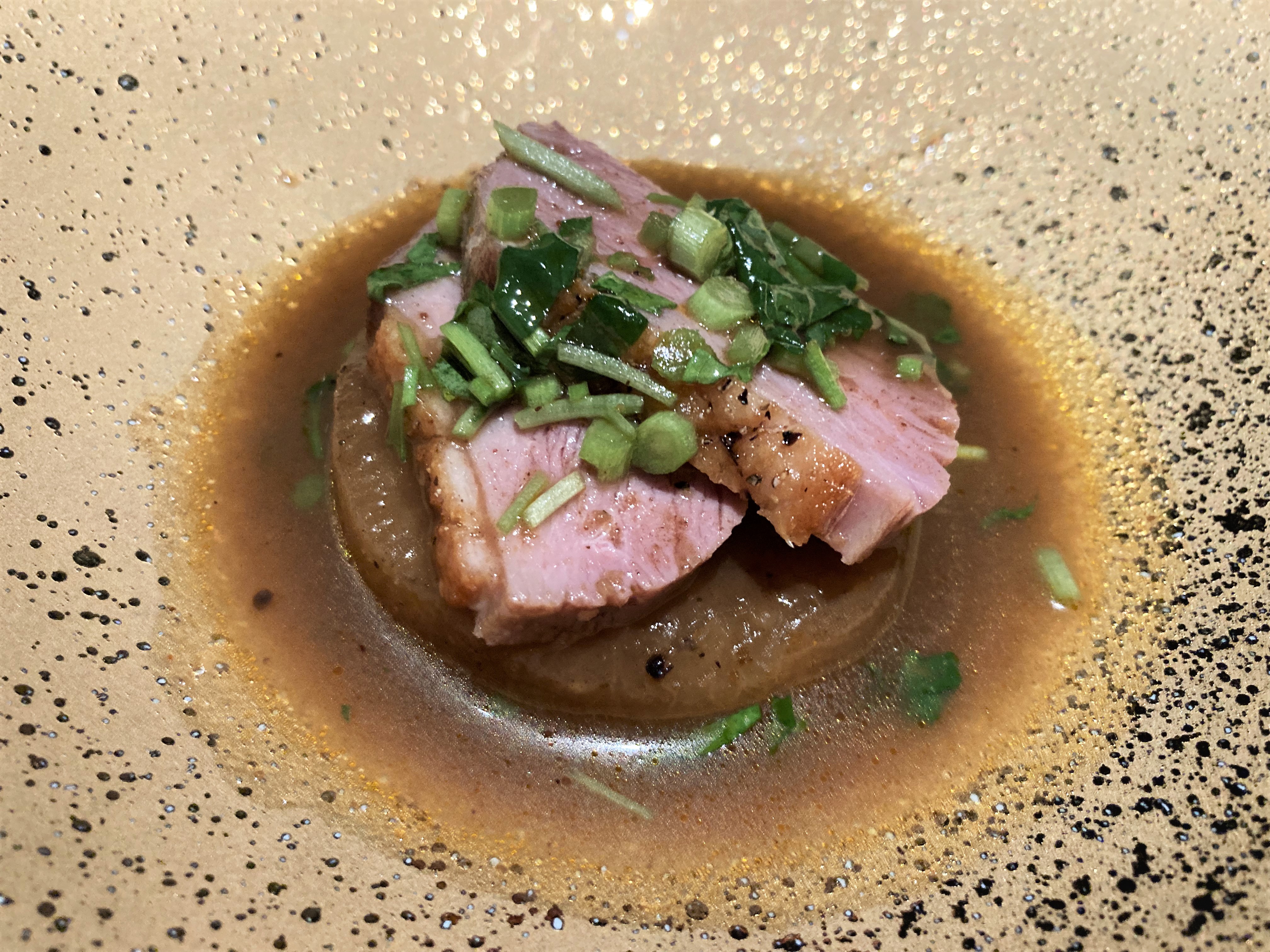 華やかでパワフルなマリアージュ。ワインのスモーキーさが大根や出汁の旨味にも合う。テクスチャーも良い。