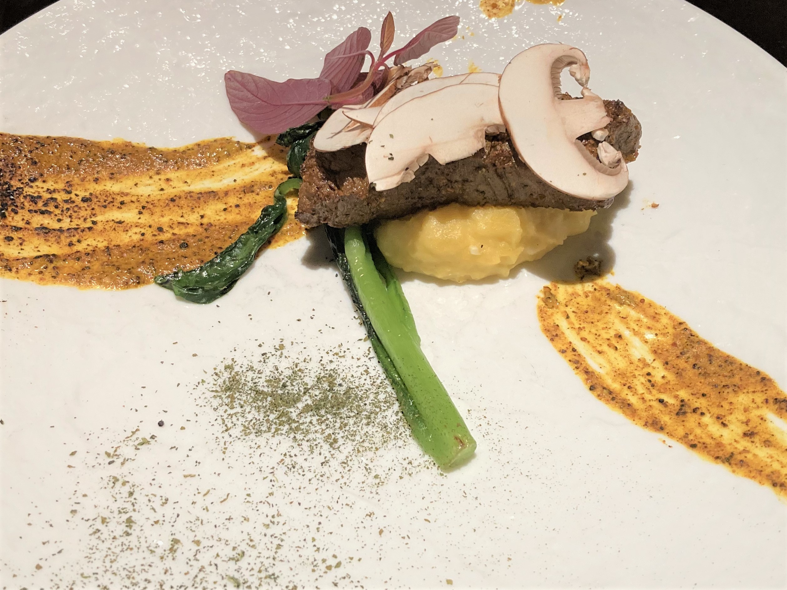 スパイスが活き、ピノ・ノワールの華やかな香りが相まってスタイリッシュなマリアージュ。牛肉が軽やかでしっとりしているため、テクスチャーも良く合った。キレイにまとまる。