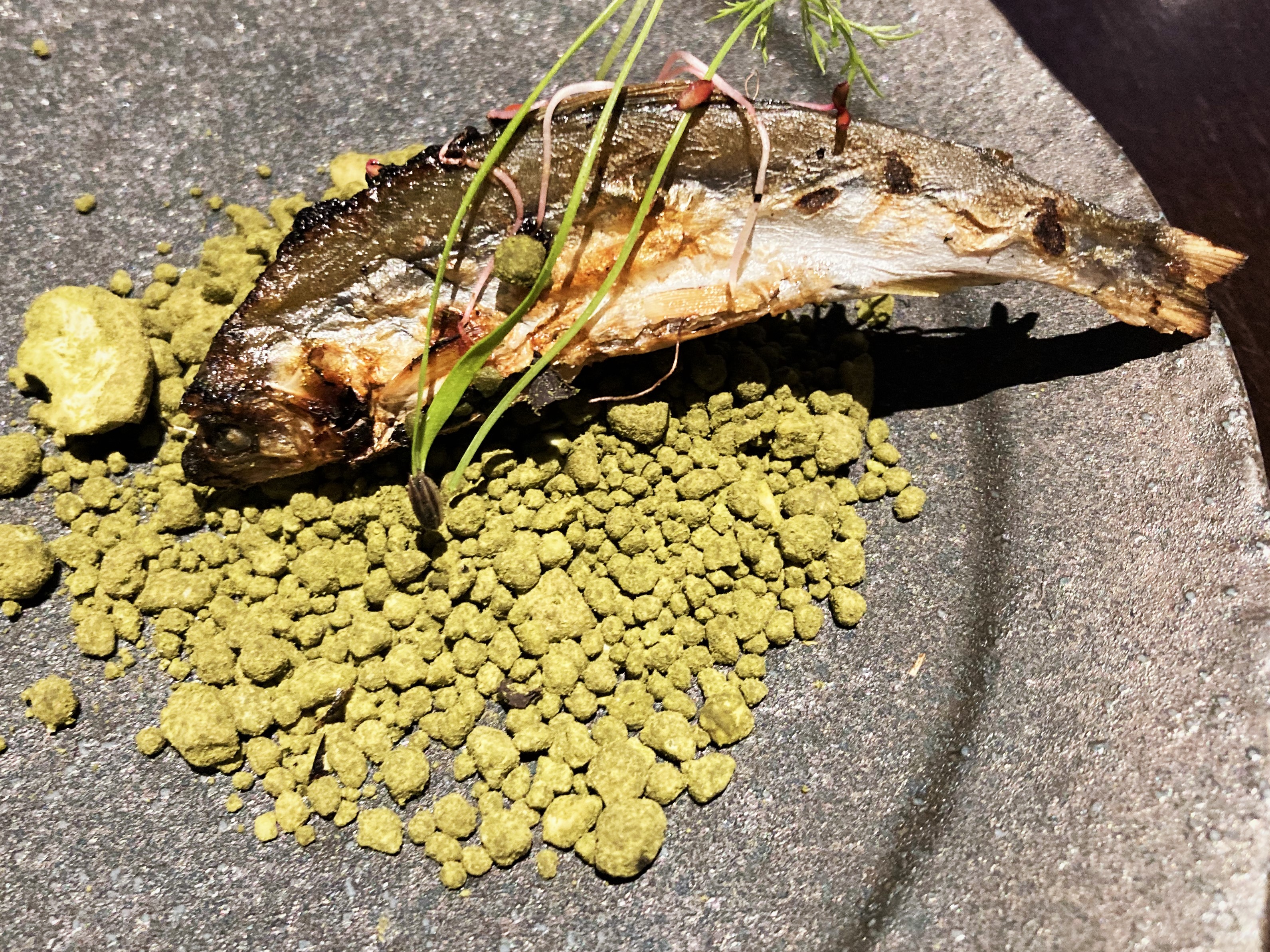 [小鮎一夜干し(炙る際に酢を塗る) / ポピーシード / ガラムマサラ/ フェンネル / 小鮎の間に黒にんにくとはちみつのソース]