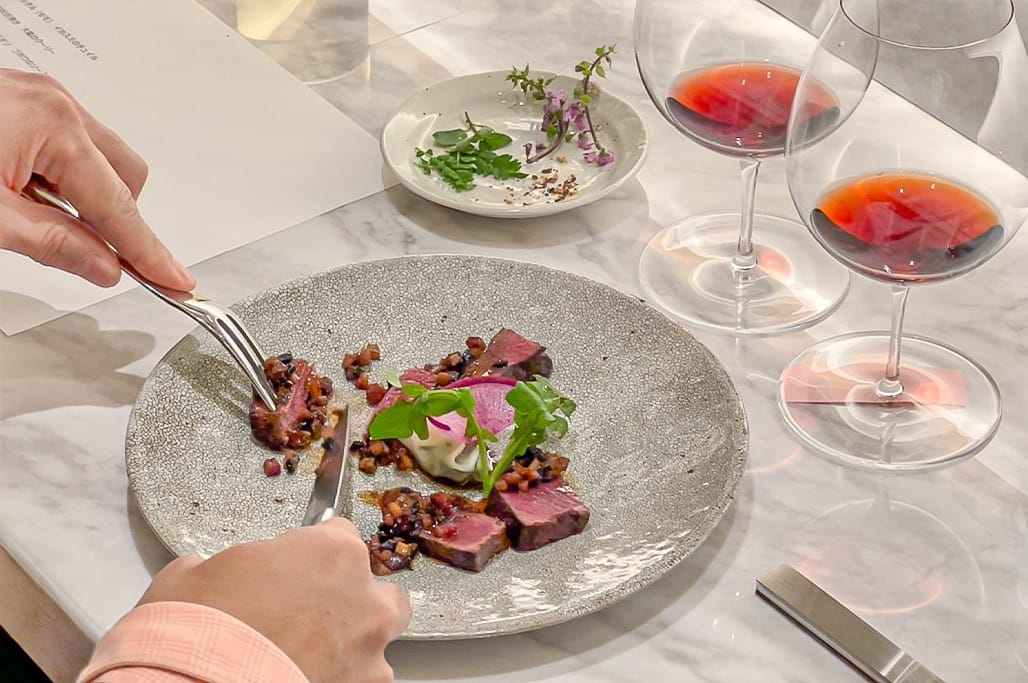 ニュイ特有の酸が特徴的でタンニンやアミノ酸がしっかりあるワインなので、肉のジュースでバランスを崩さないようにあえてレアに仕上げている。また酸が強い時には香ばしさを足すと美味しく感じるため少し焦がすように火入れしている。肉の旨味や甘味をしっかりと感じるどっしりとしたマリアージュだが、ラビオリを口に入れると酸が復活してフレッシュさや味わいの立体感も楽しませてくれた。