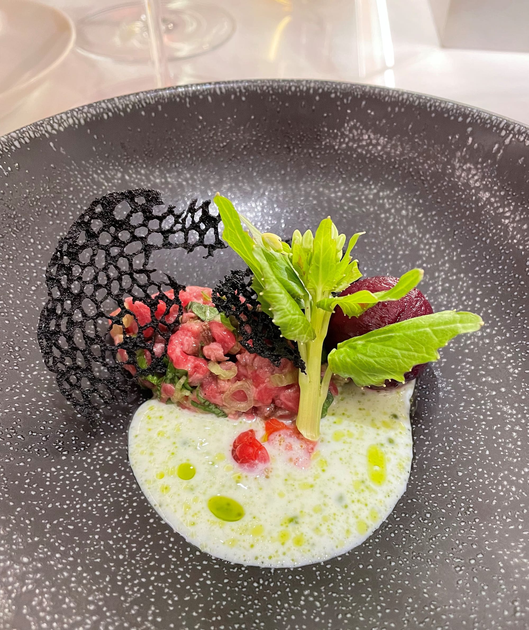 牛肉のタルタル+わさびクリームソースに、イカスミのチュイルを割り入れて和えていただく一皿。