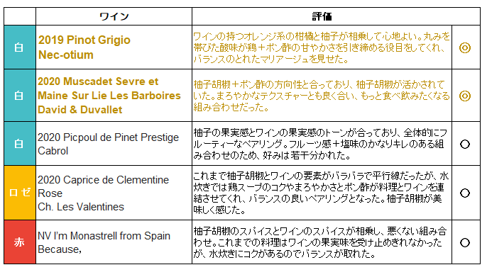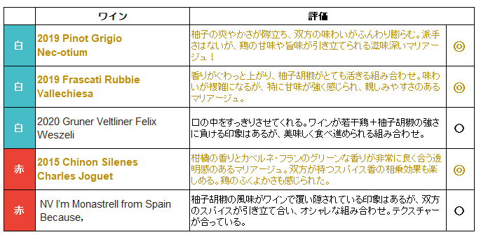 白ワインについては、シャルドネやシュナン・ブラン、ガルナッチャ・ブランカは果実の甘味が浮いてしまい、違和感を感じた。また、シュナン・ブランやアルバリーニョなどアフターに苦味が出てしまいNGだった白ワインも目立った。 赤ワインは、基本的には果実味や甘味が控えめなもの以外は難しかった。特にグルナッシュやシラーのベリー香と柚子胡椒が壊滅的に合わなかった。