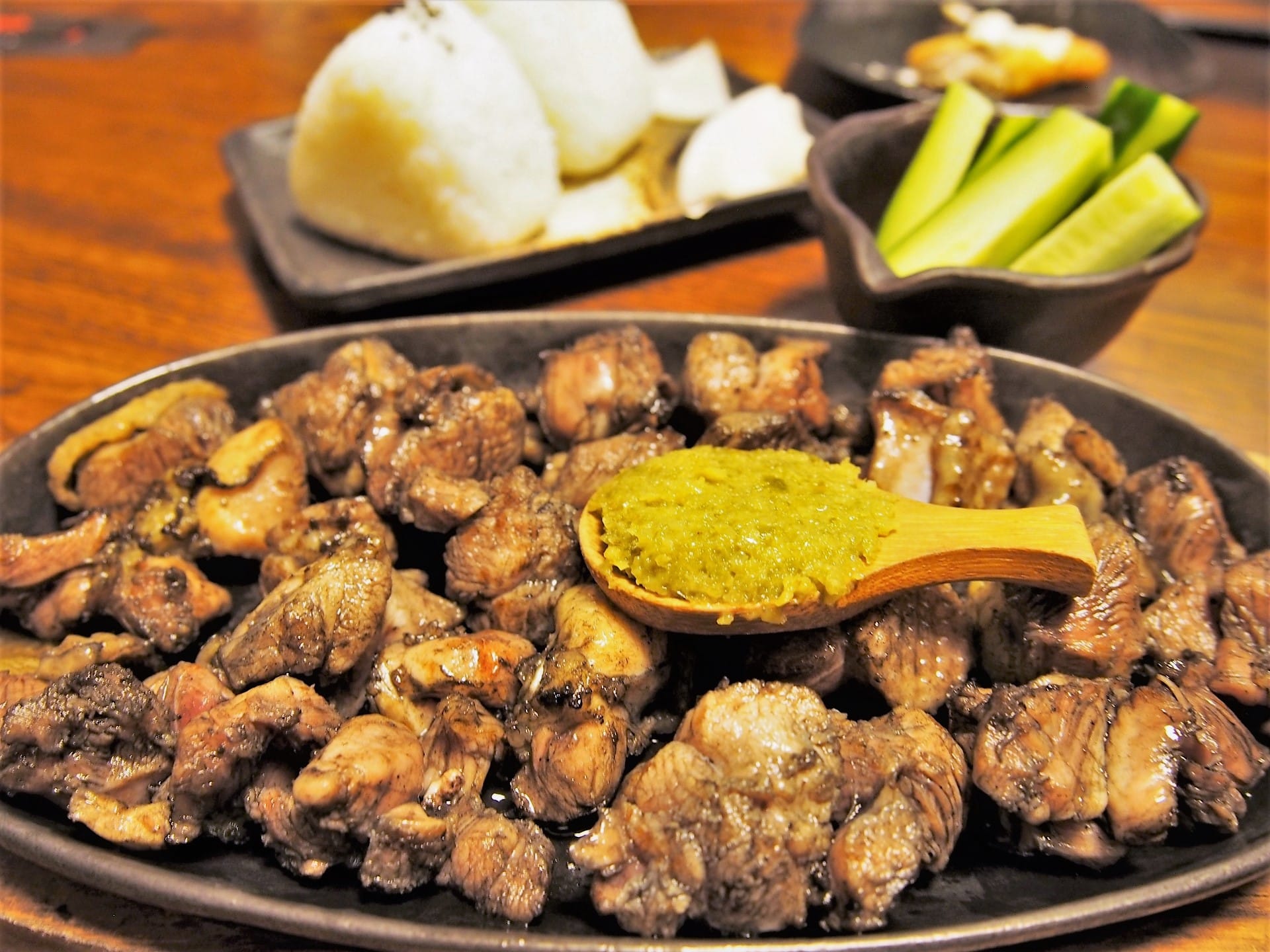 九州宮崎名物の炭火でスモークされた鶏のもも焼き+柚子胡椒