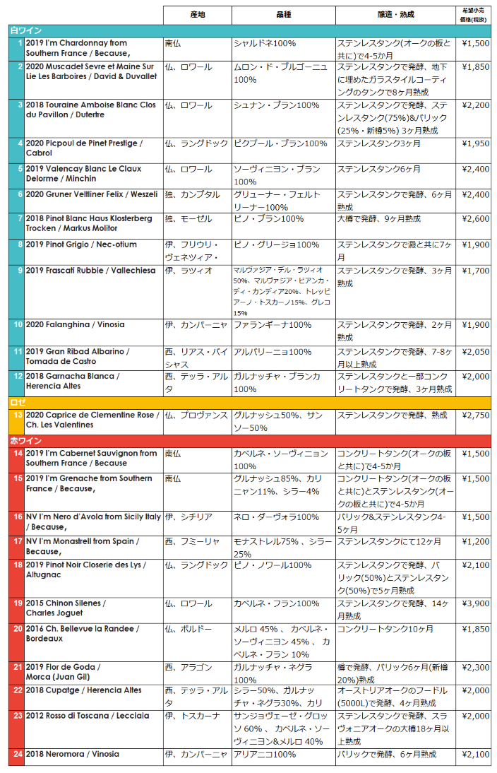 白ワイン、ロゼ、赤ワインを幅広く用意して検証しました。