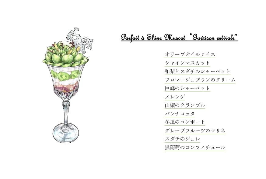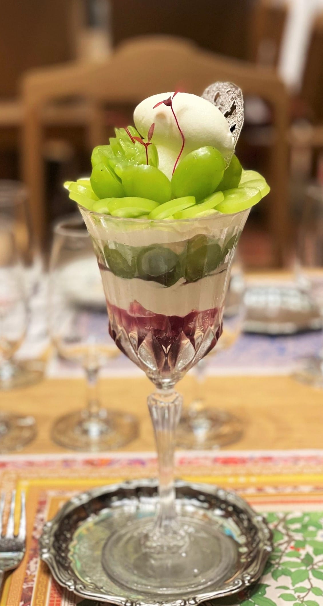シャインマスカットのパフェは、重心の低さを感じる味わいでほのかな塩味がポイントでした。