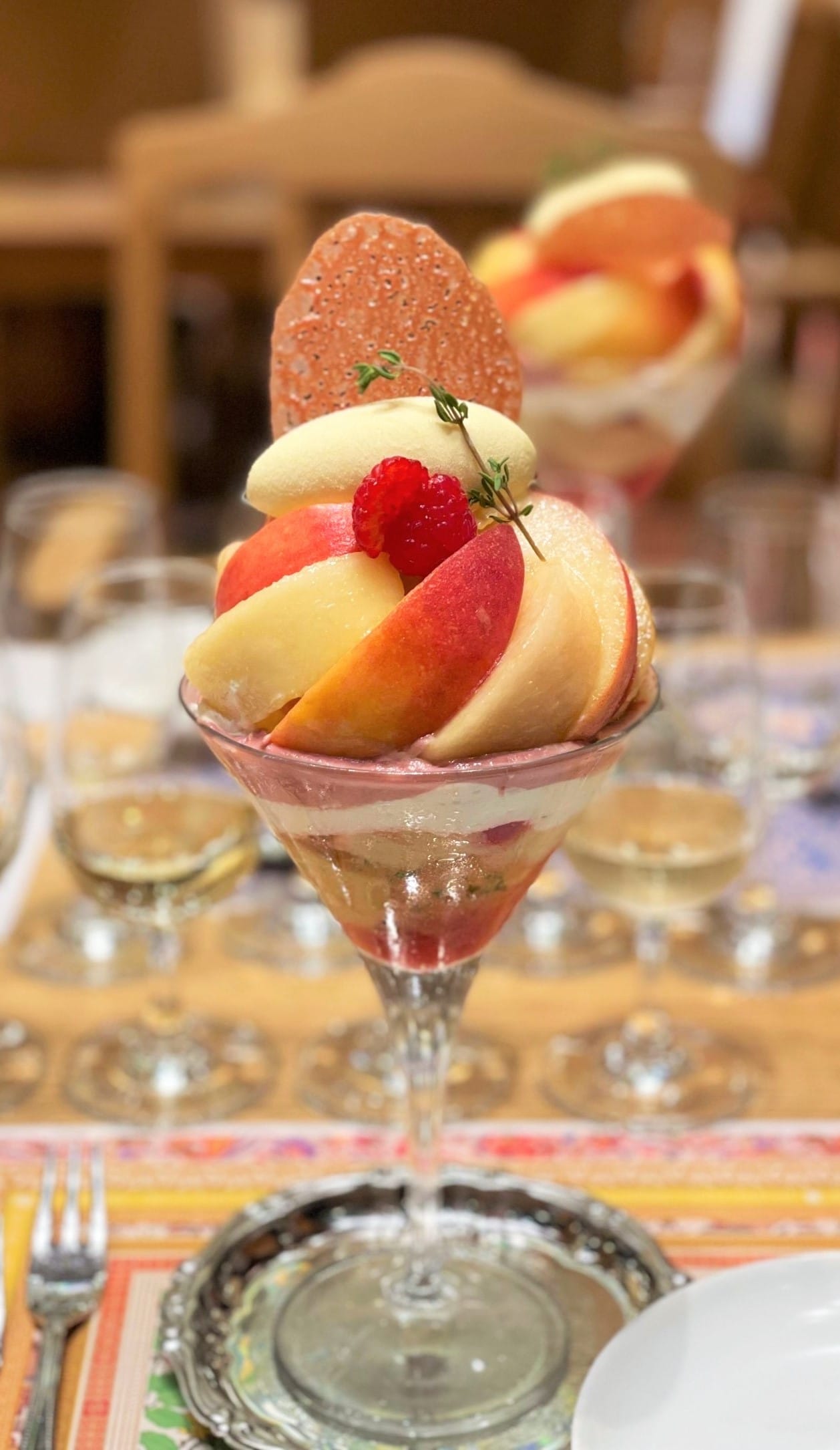 | 泡 | NV | Brut / Bernard Bremont | ◯ | 桃のフレーバーとワインのフレーバーが好相性。パフェ全体にしっかり寄り添ってくれる。ただしシャンパーニュは旨味が強く複雑な味わいなので、パフェでは受け止めきれていないように感じた。 |