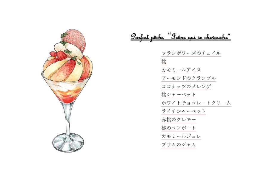 例えば桃パフェであれば、最初は大ぶりに切られた桃をガブリと一口、その後はカモミールアイスと桃を一緒に味わったりココナツのメレンゲを加えてみたり、下の方が見えてくればホワイトチョコレートクリームとライチシャーベットをすくって桃と一緒に食べ、アイスやシャーベットが溶けたら底の方のジュレやジャムと混ぜ合わせて渾然一体になった状態で食べる・・・と様々な組み合わせで食べ進めることになります。驚きなのは、そのひと口ひと口、どんな組み合わせでも必ず美味しく調和していること!!シャインマスカットのパフェでも同じように素晴らしい一体感がありました。