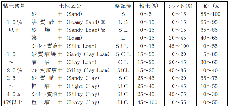 この大別された4種類の要素の混合比率に応じて、できあがる土の性質が変わり、異なる土壌として見なされています。例えばローム土壌であれば粘土が0~15%、シルトが20~45%、砂が40~65%で構成されると定義されています。