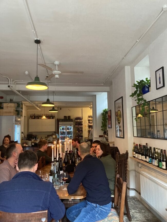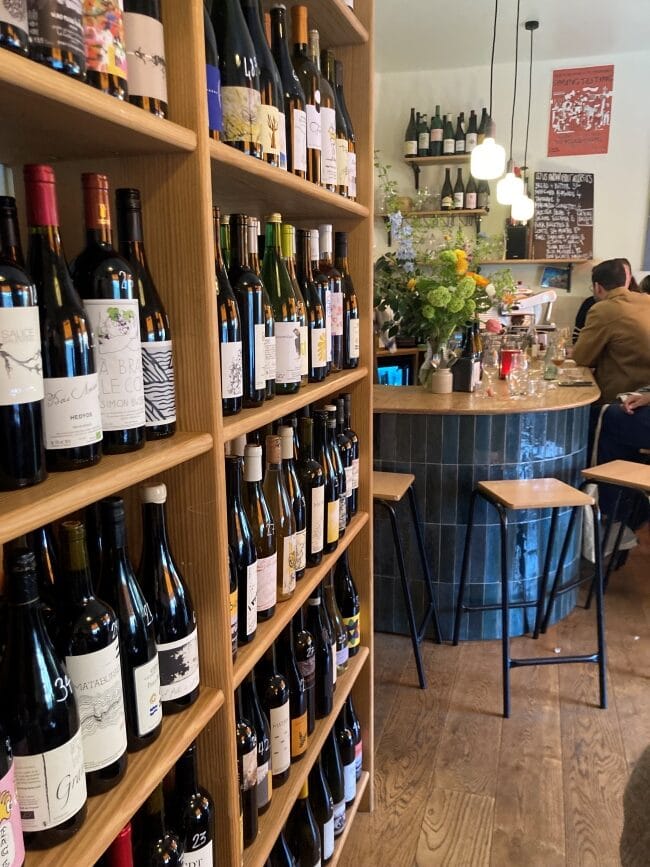 飲食店でのワインの楽しみ方は、ガストロノミーの場面のみではなく、気が置けない仲間や家族とのカジュアルな場面においてもその醍醐味があります。 ロンドンでもそのような用途の際に美味しい誠実なワインを楽しめる場が増えてきました。最近の流れとして、ワインショップ兼ワインバー形態の店を頻度よく見かけます。賑やかな通り沿いにあったこれまでのワインバーとは異なり、その多くが中心部から少し離れたエリアや住宅街に位置し、ローカルの憩いの場として愛されています。 これらの店の特徴は陳列棚に並べられたワインを持ち帰るワインショップの側面に加え、コルケージ(相場は一律£12−15)を払えばそのまま店内で提供してもらえます。