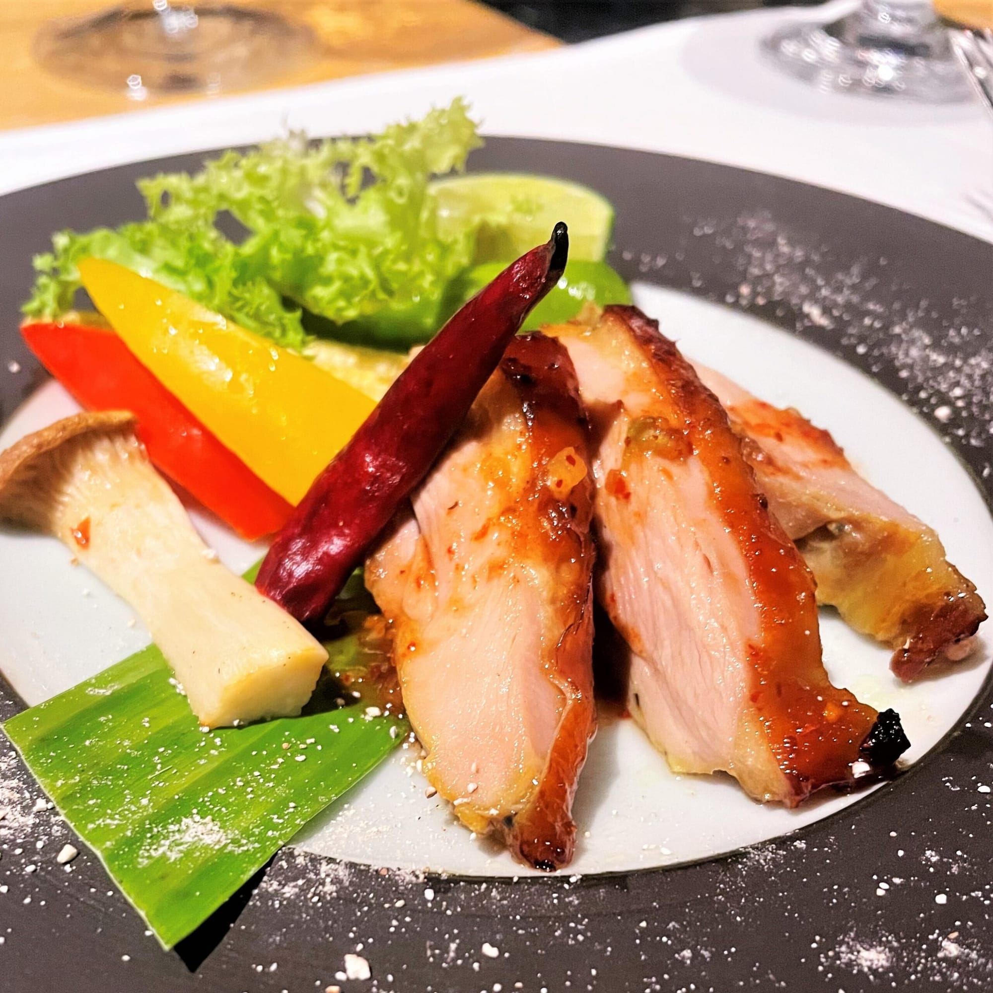◎ 4. ソーヴィニヨン・ブラン/カリフォルニア ◎ 6. シャルドネ/仏ジュラ ◯ 15. キャンティ・クラシコ/伊トスカーナコブミカンなどのタイらしいハーブに漬け込んだ地鶏のグリルで、脂はさほどなくさっぱりとした噛みごたえのあるお料理でした。 ソーヴィニヨン・ブランはお肉のハーブ香とワインの香りが良く合っており、カリフォルニア産ならではの果実味の強さと柔らかい酸がお肉の風味を引き立て、ワインも料理も両方がしっかり活きたペアリングでした。 ジュラのシャルドネは、産膜酵母下での熟成による独特の香りとグリルした地鶏のメイラードの香りやハーブ香が合っており、甘味が引き出されて料理の塩味とも良いバランスでした。アフターが美しく続くのも印象的でした。 キャンティ・クラシコはもう少しお醤油感や出汁感があればより合うように思いましたが、お肉を更に美味しく感じさせてくれ、ワインの果実味が足されることが唯一好ましく感じた赤ワインでした。