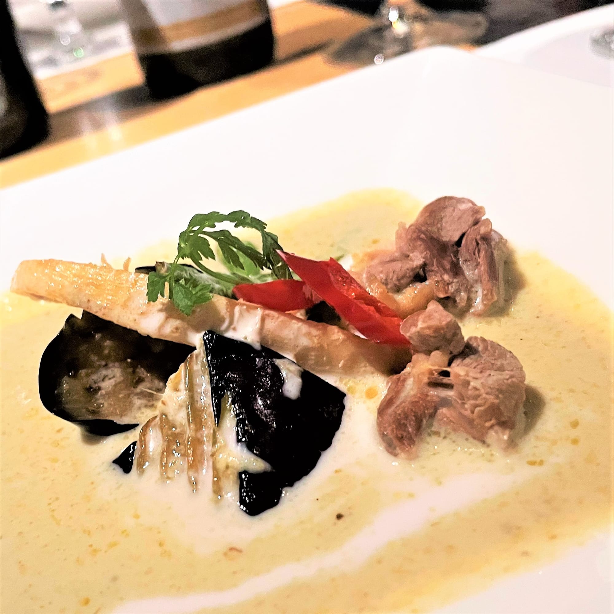 ◎ 4. ソーヴィニヨン・ブラン/カリフォルニア ◯ 6. シャルドネ/仏ジュラしっかりと辛味があるグリーンカレー。青唐辛子が鮮烈ですが、ココナッツミルクのクリーミーさが上手にまとめていて上品さがある一皿でした。 カリフォルニアのソーヴィニヨン・ブランは、パイナップルの香りが出てカレーの野菜と合い、樽香が浮くことなく寄り添っており、辛味の刺激を心地良く感じさせてくれる秀逸なマリアージュでした。 ジュラのシャルドネは酸化のニュアンスがナンプラーの風味と良く合い、樽香もカレーをより美味しく感じさせてくれました。