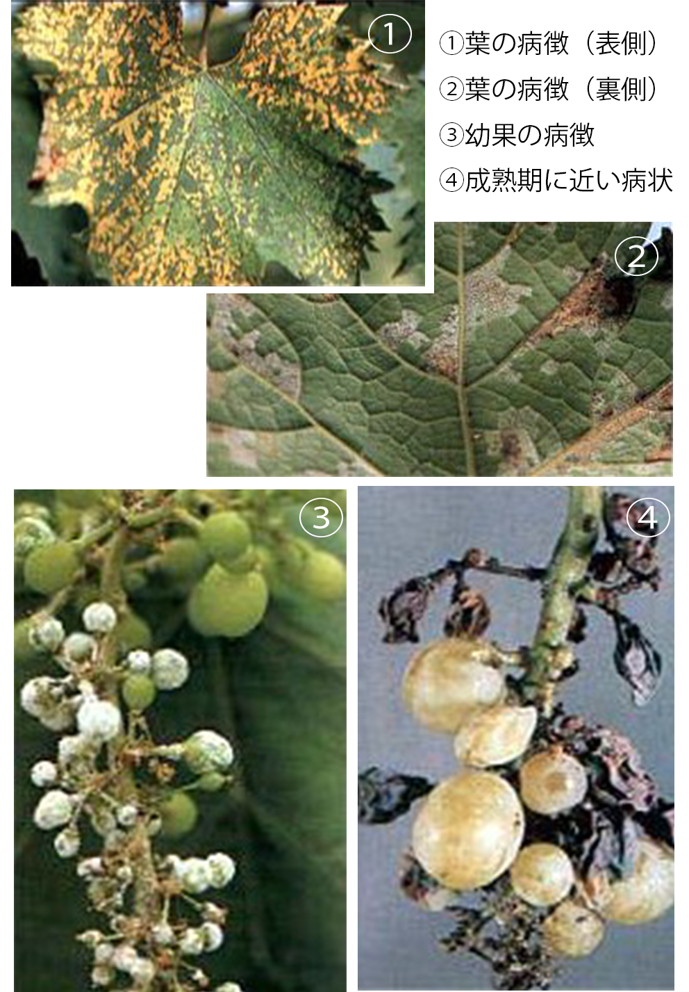 この菌は落ち葉の上で越冬し、一旦ブドウ畑に出現すると、薬剤の定期的な散布で防除ができるとしても、根絶することはできない。暖かく湿った環境を好み、春になり、暖かくなってくるとブドウ樹の緑色部分に感染し、拡大していくと花やブドウの果粒を侵し、作物の完全な損失に繋がる。感染したブドウは革のようになって萎びる。収穫時に被害が多いと、感染したブドウ樹はワインに特有なカビ臭を残す。