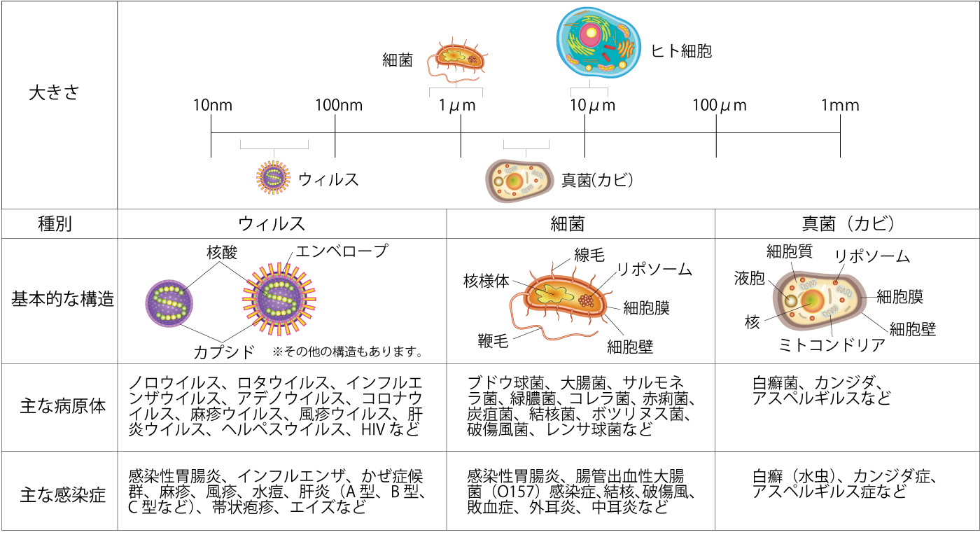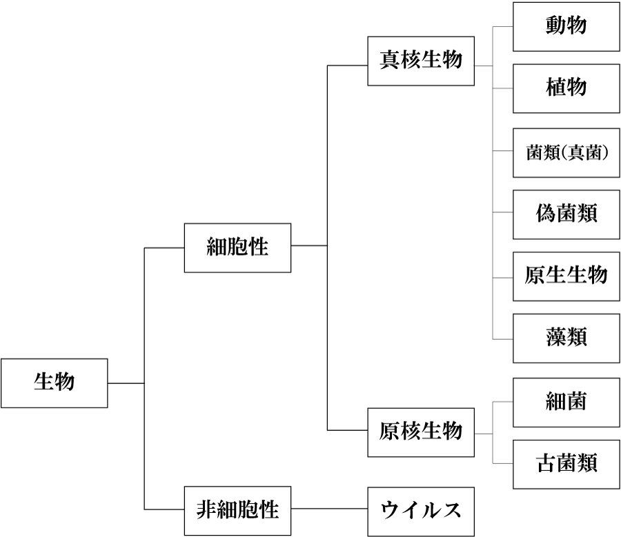 人間、そして植物に影響を与える感染症は世界中に数多くありますが、主にウイルス、細菌、真菌(カビ)といった目に見えない病原体によって引き起こされています。これら病原体の違いを説明すると長くなってしまいますが、下記の表の通り、細胞性か非細胞性か、そして細胞性の中でも真核生物か原核生物※かで分かれていき、その基本構造、サイズ、感染・増殖方法などが異なります。