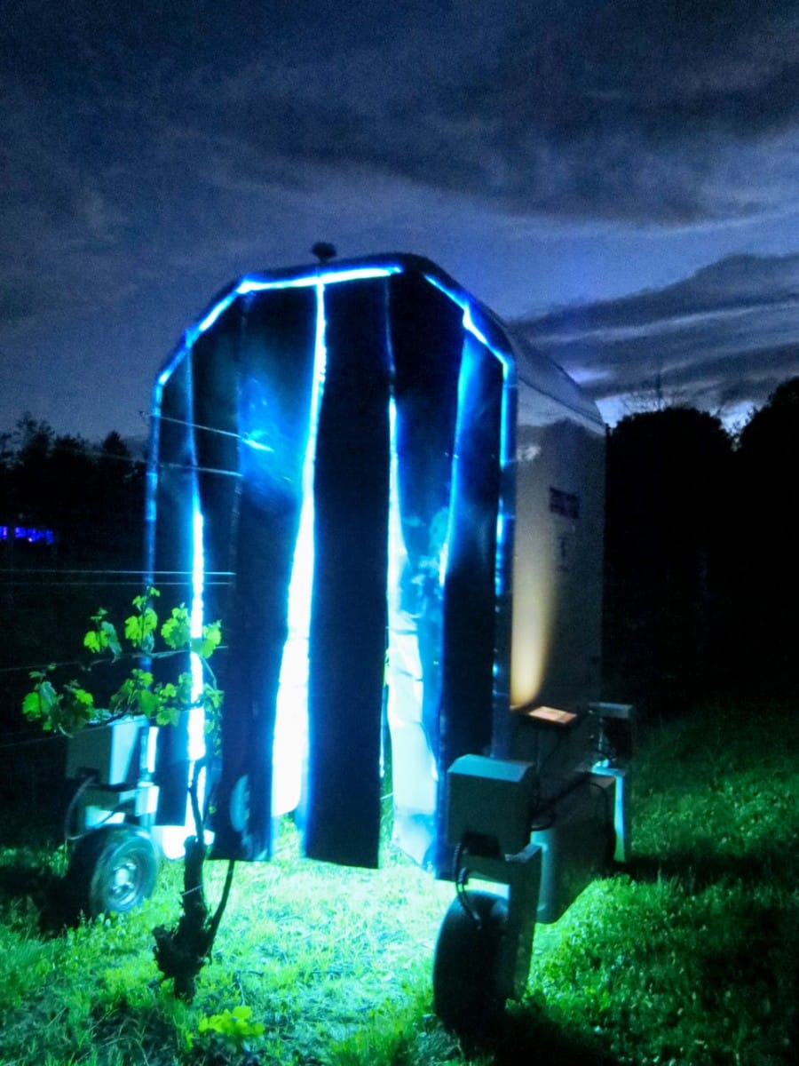 UVロボット「Thorvald」。コーネル・アグリテックの研究用ブドウ園にて、 夜間にブドウの木に紫外線を照射。 (画像提供:David Gadoury)