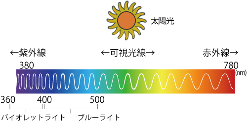 そして400~500nmの波長のブルーライト、紫外線とブルーライトの境界域にある360〜400nmの波長のバイオレットライトがあります。(バイオレットライトは適切なタイミングで適量を浴びると人体に好影響をもたらすと知られている)