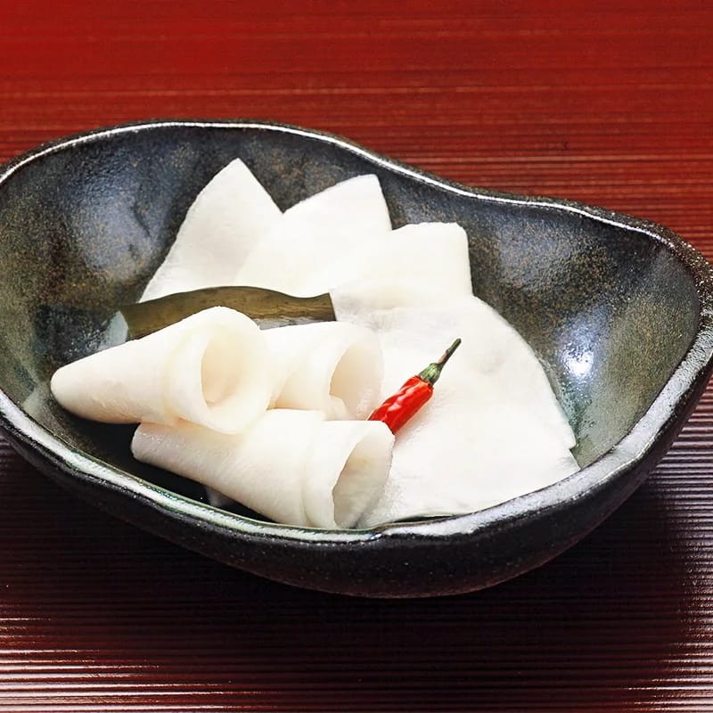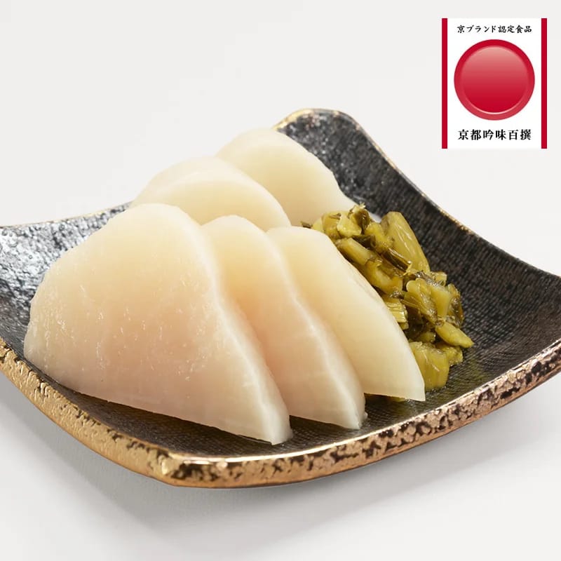 京野菜のひとつである聖護院かぶらを利尻昆布とともに漬け込んだ冬の京漬物の代表です。ひと樽に漬け込むかぶらが千枚になるほど薄く削ったことから「千枚漬」と名付けられたと伝えられています。