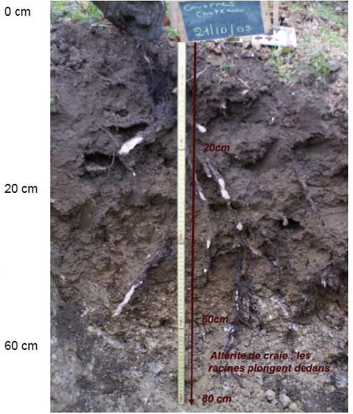 また、健康な土壌では雨が地下深くまで浸透するとともに、ブドウ木の根も母岩まで届くほどに伸びていきます。