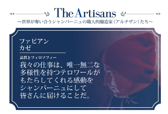 この基準を満たす生産者を「アルチザン・シャンパーニュ(職人的醸造栽培家)」と定義し、彼らの想いを漏らさずお客様へお届けできるよう精進しております。