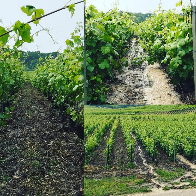 また、健康な土壌で良いブドウを育てるためには水がとても大切です。下の写真のうち、左側は土壌がふかふかで雨が降った時にしっかりと土壌の奥深くまで水が浸透していきます。