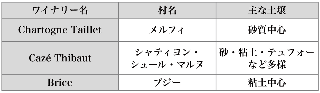それぞれの生産者の村名と主な土壌は以下の通りです。テュフォーについて補足すると、ロワール地方でも有名な土壌で、多孔性に富み、保水性が高いのが特徴です。尚、この表はあくまで主なものであり、実際にはさまざまな土壌が入り混じっています。