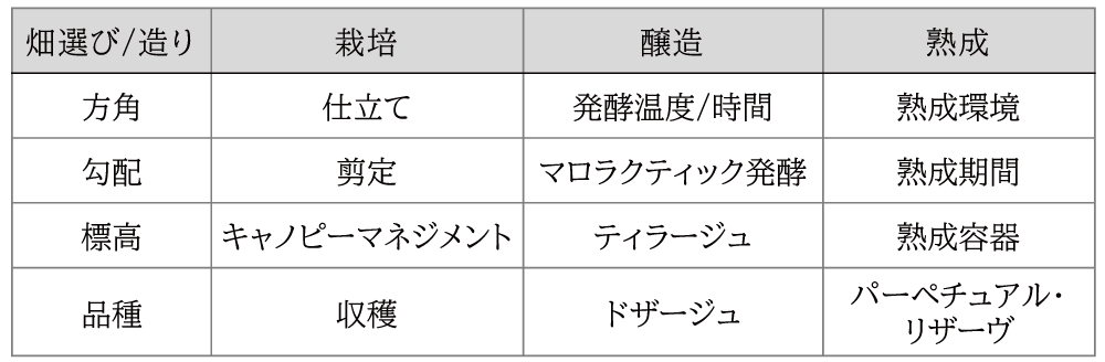 山田 ワイナリーが取る選択肢というのは非常に多岐に渡ります。この表にあるのは一例でしかありませんが、それぞれ2つのポイントからお話を伺っていきましょう。
