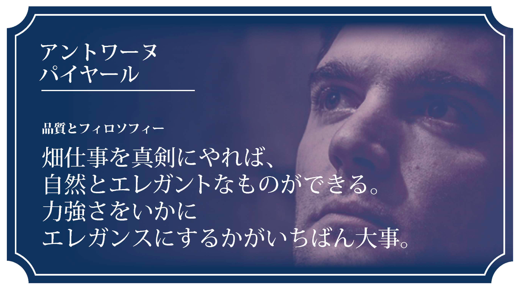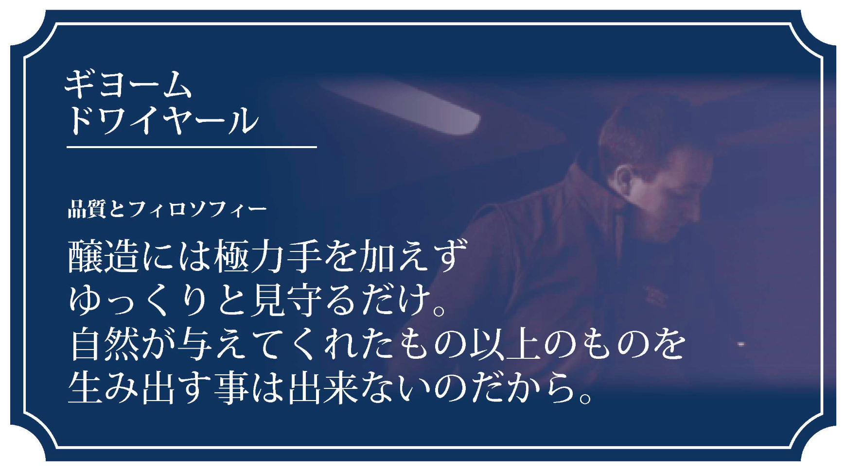 この基準を満たす生産者を「アルチザン・シャンパーニュ(職人的醸造栽培家)」と定義し、彼らの想いを漏らさずお客様へお届けできるよう精進しております。