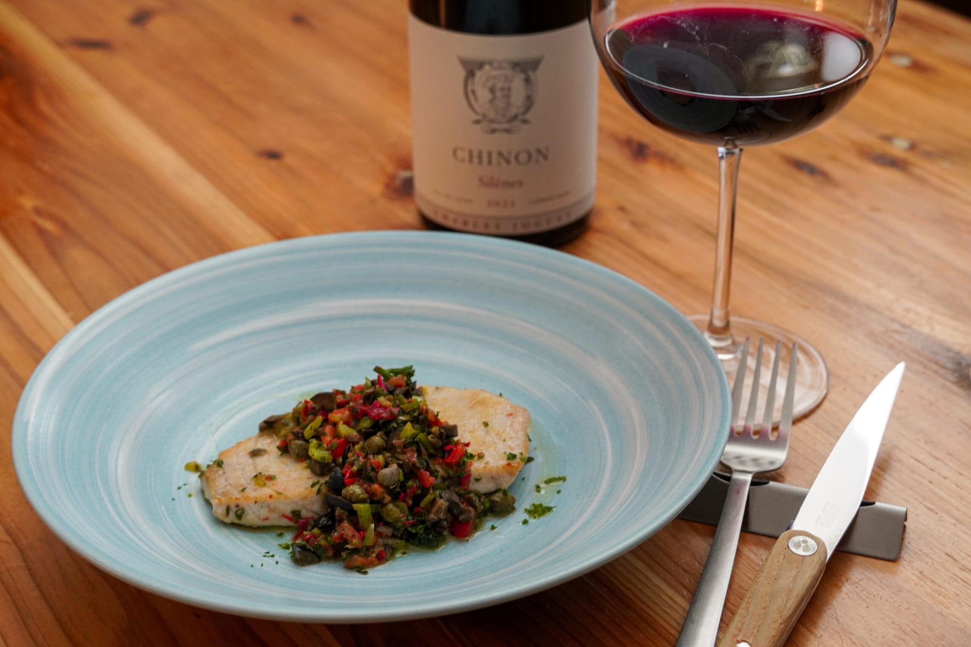 カジキマグロの脂が乗った身のふんわりした食感とシノン・シレーヌのテクスチャーが同調していて心地良く、ソースのピーマンがワインのグリーンなニュアンスととても合いました。また、お料理の複雑さと、ワインの持つ様々な香りや酸味、果実味などの要素が引き立て合い、ワインと料理双方の甘味や旨味を増幅させてより美味しく感じさせてくれました。