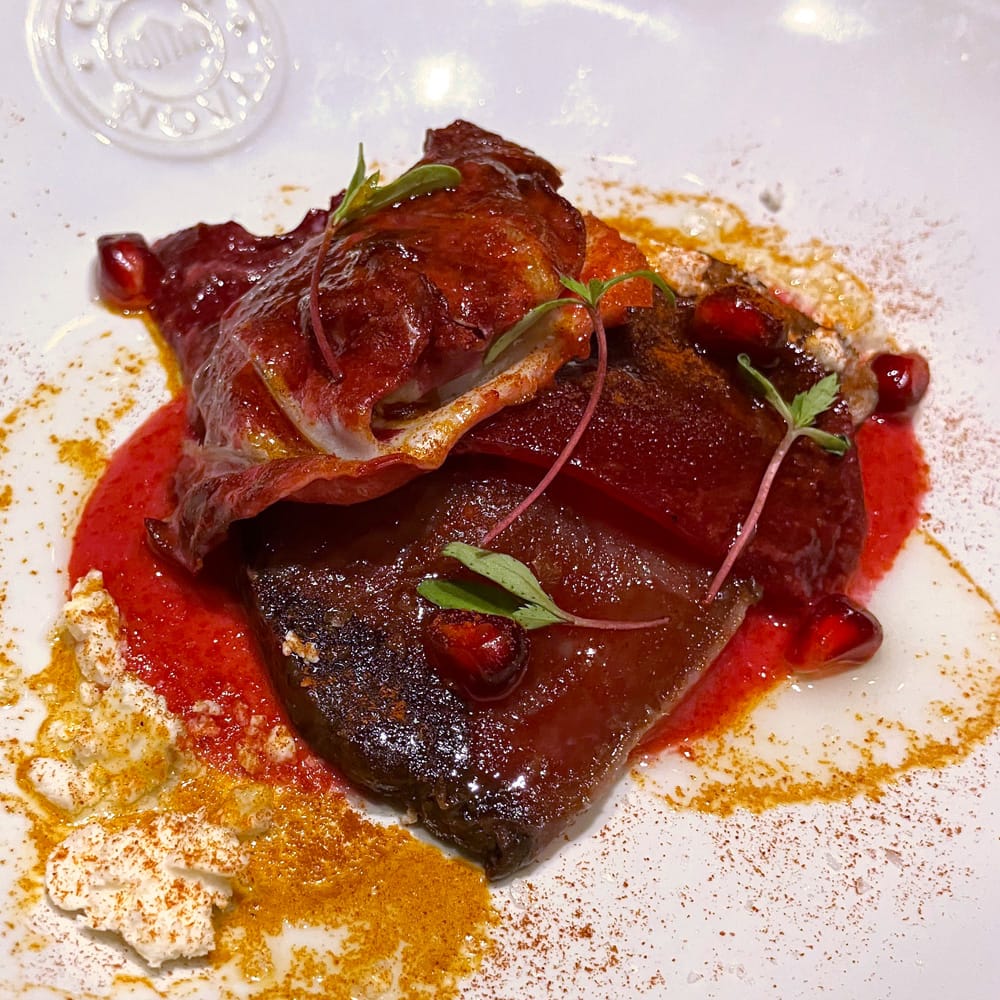 甘いビーツ、スモークパプリカ(鰹のスモークと同調)、トレビスの苦味、ザクロが一体に。
