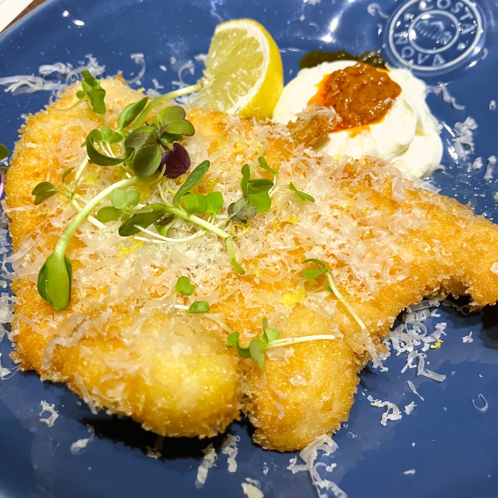 薄く叩いた鶏肉のカツレツ。サワークリームとヨーグルトを混ぜたソースと、