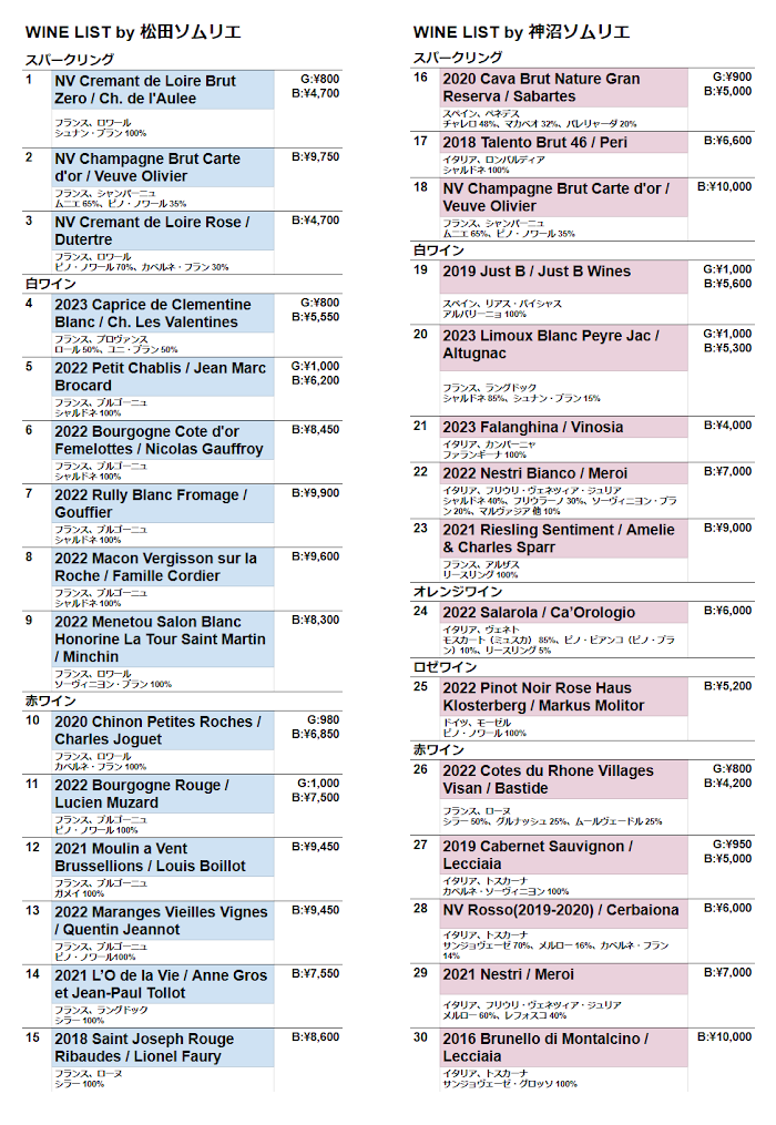 松田ソムリエのリストは、すべて精通されているフランス産のワインで統一されており、同じブルゴーニュのシャルドネであっても細やかな味わいの違いを意識しながら精緻にマリアージュを突き詰めていく姿勢が印象的でした。一方、神沼ソムリエがセレクトした多種多様なワインリストは、意外な組み合わせが見つかったりと可能性を広げてくれるものでした。ペアリングを考える上で、お客様に提供する順序やストーリーを常に意識されており、単なる「合う/合わない」だけではない現実的なマリアージュ提案の重要性を改めて実感しました。