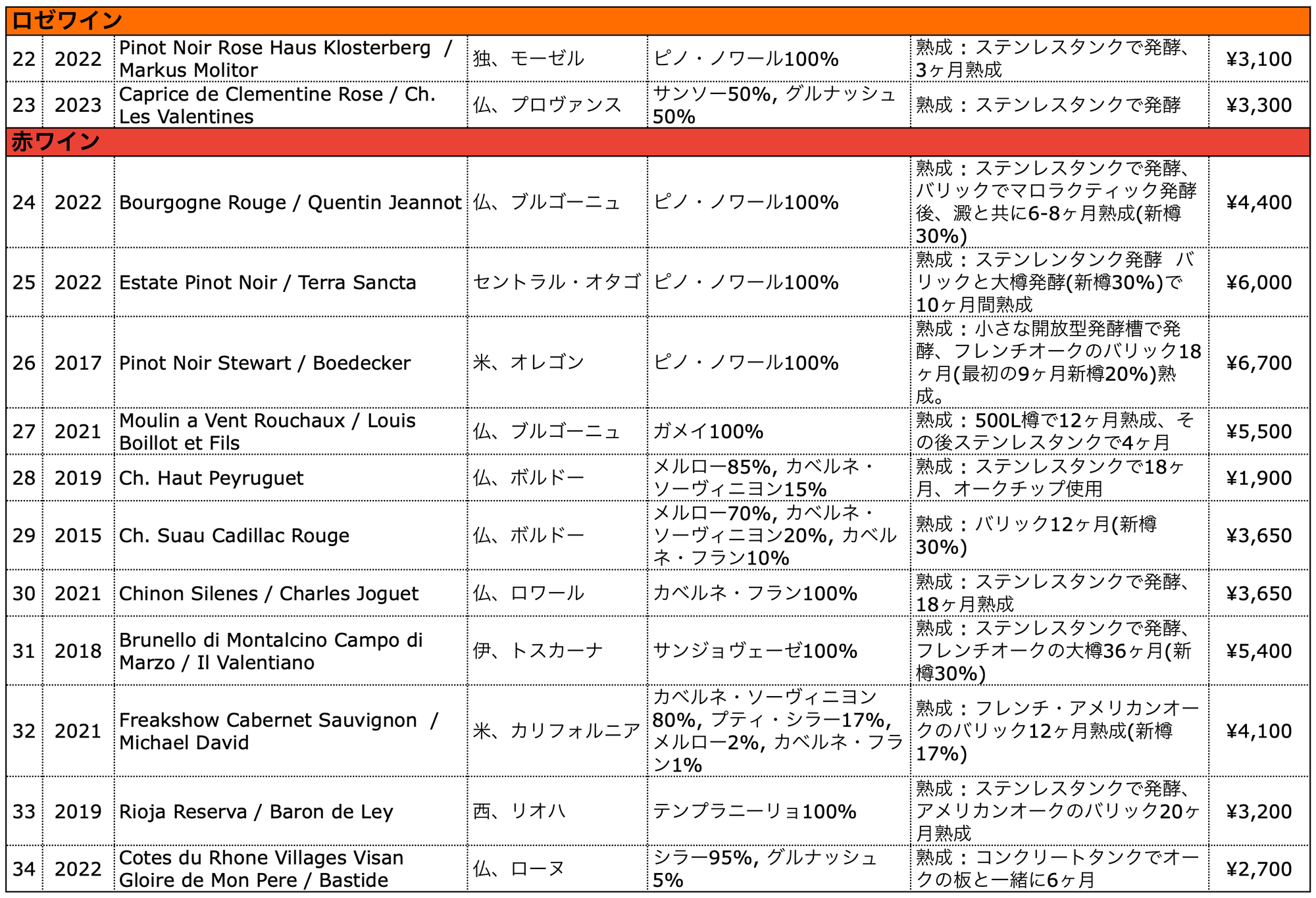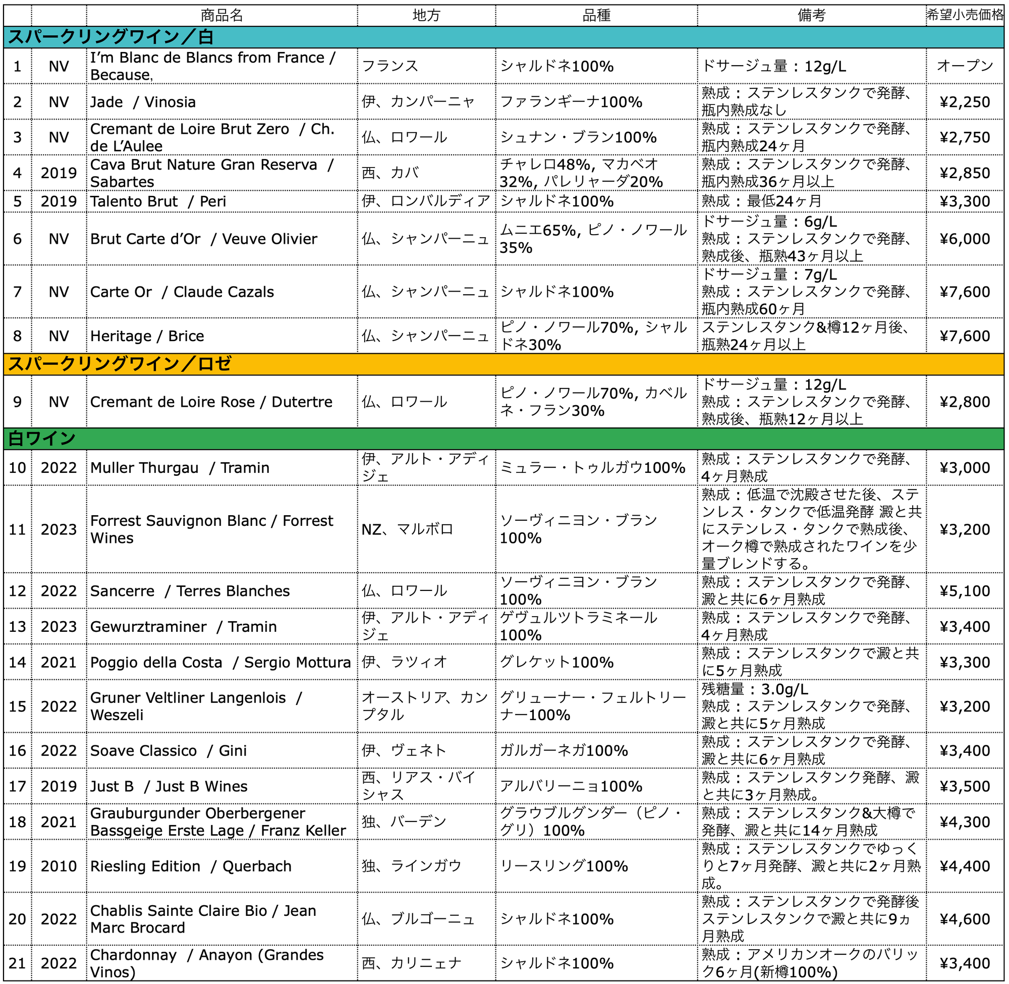 スパークリングは白8種類とロゼ1種類、白ワイン12種類、ロゼワイン2種類、赤ワイン11種類の計34種類用意しました。